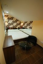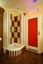 Rekonstrukce pokojů v Showparku pokračuje a my Vám velmi rádi představujeme již 3. zrekonstruovanou místnost. Tento pokojík je vymalován v béžovém tónu a zeď kolem postele zdobí květiny v hnědé barvě, což působí velmi příjemným a uklidňujícím dojmem. Motiv tmavého dřeva, ze kterého je vyroben nábytek, se opakuje i na podlaze a na obložení koupelny. Interiér pokoje je vkusně sladěn v hnědých tónech. Vybavení pokoje tvoří velká, pohodlná postel obložená zrcadly, komfortní křesílko se stolečkem, plně zásobený minibar a sprchový kout. Vše je zcela nové a připravené pro Vaše pohodlí a relax ....